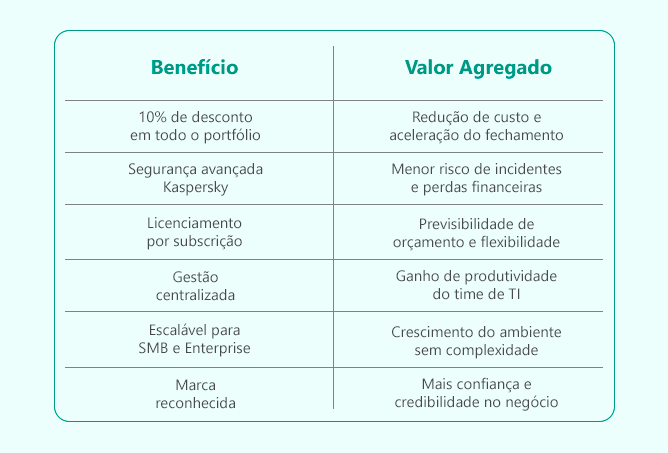 • Condição válida sobre toda a lista de preços Kaspersky na modalidade upfront;